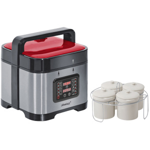 Мультиварка-скороварка-медленноварка, чаша из нержавеющей стали с двойным дном (5 л), крышка для стальной чаши, корзина для готовки на пару, держатель для паровой корзины, керамические стаканчики (4 шт.) по 230 мл, держатель для керамических стаканчиков, запасное уплотнительное кольцо для крышки, мерный стакан, лопаточка для перемешивания, книга рецептов, руководство по эксплуатации